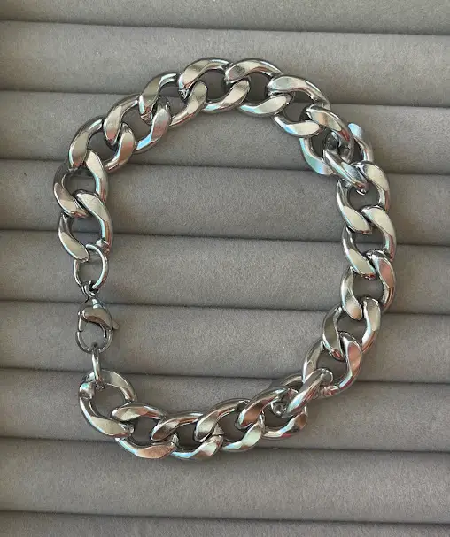 Robusta e elegante, esta pulseira é confeccionada em aço inoxidável de alta qualidade, garantindo resistência à oxidação e brilho duradouro. Seu design clássico de elos groumet oferece um visual sofisticado e atemporal, ideal para uso diário ou ocasiões especiais. Confortável no pulso e com fechamento seguro, é uma peça versátil que combina com qualquer estilo, do casual ao elegante.